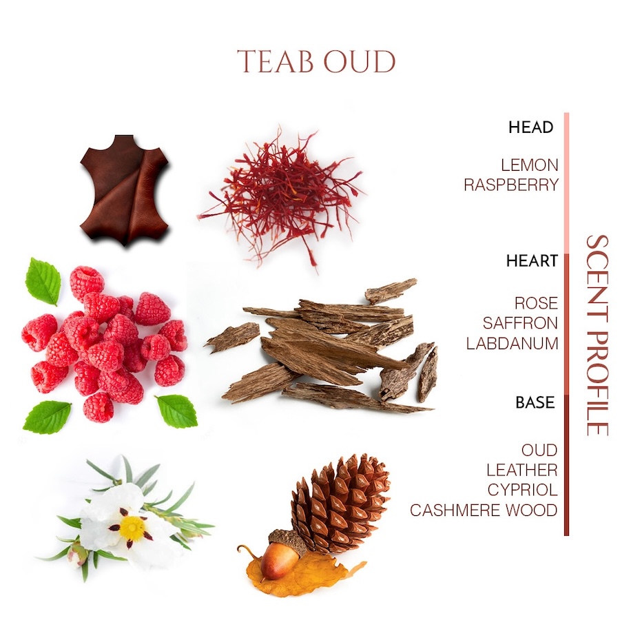 Cashmere Wood, Leather, Oud, and Cypriol: the note composition of Teab Oud was inspired by the opulence of Middle Eastern royalty. The scent of oud is distinctive, sweet, and derived from agarwood trees, an Asian element confined to specific parts. Teab Oud’s universal blend represents the splendor of royalty across continents and is a preferred choice among royals and heads of state of today.
